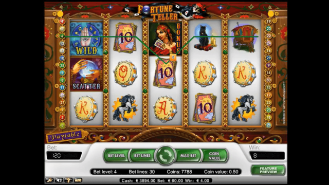 В игровом автомате Гадалка 5 активных барабанов, 30 рабочих линий, спецсимволы, бонусный раунд и автоплей. Диапазон ставки — от 1 до 5 монет, стоимостью от 1 до 50 центов. Выбрать размер ставки пользователь сможет самостоятельно. Новичкам стоит начинать с минимальной суммы.