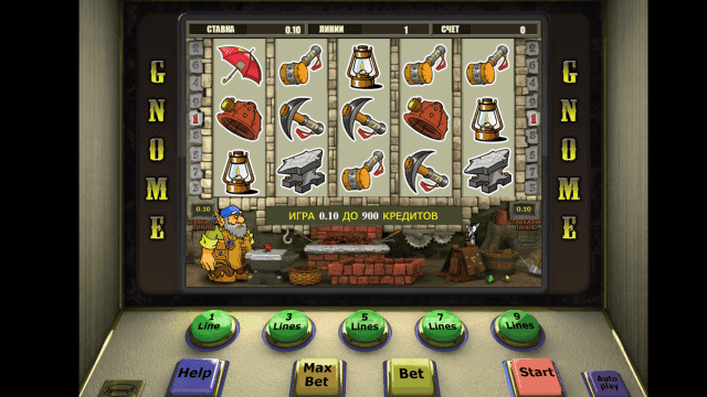 В видеослоте Gnome имеется 5 барабанов и 9 линий. Действует многоуровневая система ставок. Количество активных линий можно изменять. Стоимость одного кредита равняется одному рублю. Минимальная ставка на каждую линию — 1 руб., максимальная — 90 единиц игровой валюты.