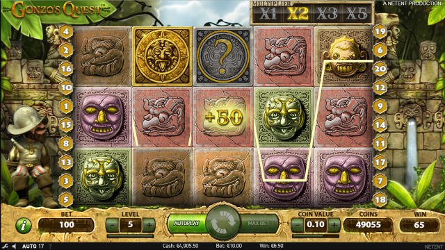Азартный слот Gonzo’s Quest на приключенческую тематику, главный персонаж которого испанский конкистадор Гонзо. Перед началом игры гэмблер увидит мини-ролик, рассказывающий предысторию событий, в которых будет участвовать игрок. Герой постоянно присутствует на экране, он контролирует спины и реагирует на происходящее.